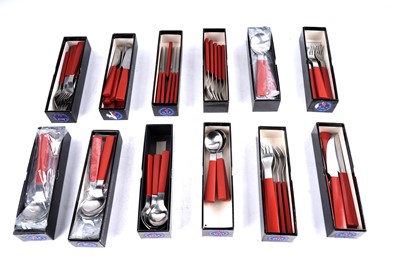 Lot 429 - A set of David Mellor stainless steel cutlery with burnt orange acetal handles
