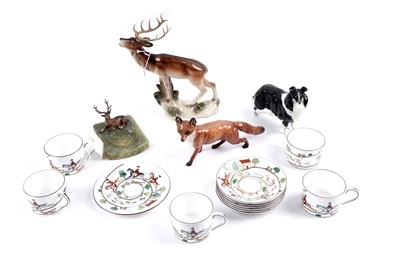 Lot 345 - A cold-painted bronze stag ashtray and a hunting ceramic wares