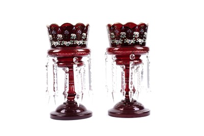 Lot 394 - A pair of Victorian cranberry glass table lustres