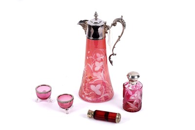 Lot 396 - A Victorian cranberry glass jug; and a selection of silver wares