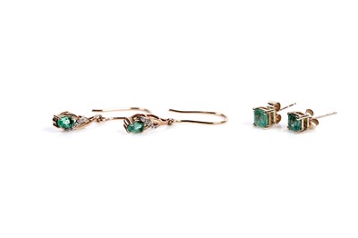 Lot 614 - A pair of emerald and white stone drop earrings; and a a pair of emerald stud earrings