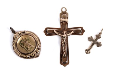 Lot 650 - Two gold crucifix pendants; and a St Christopher pendant