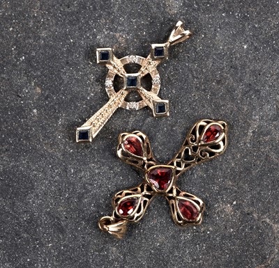 Lot 687 - A sapphire and diamond crucifix pendant and a garnet crucifix pendant