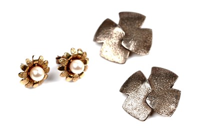 Lot 106 - A pair of 18ct gold and pearl stud earrings; and a pair of silver-gilt Postmodernist ear clips