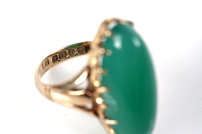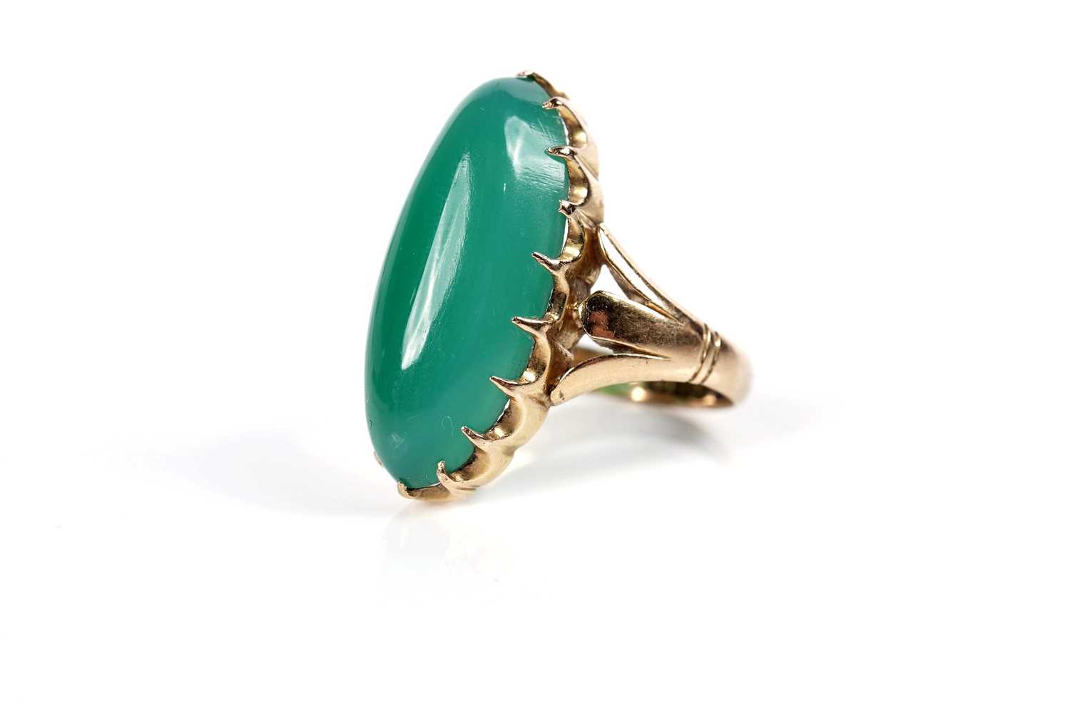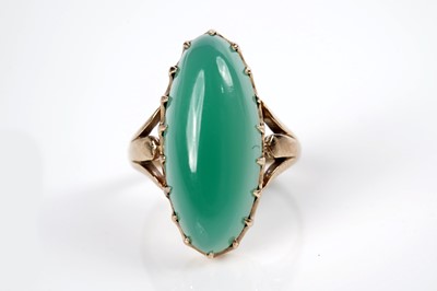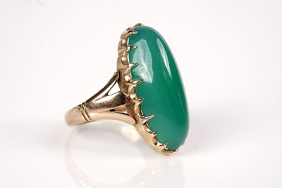 An Edwardian green chrysoprase ring, the oval cabochon measuring 22.5 x 10.3 x 5.8mm, within 18ct yellow gold mount and shank, by AI Chester 1906, ring size N, 6.2g gross.