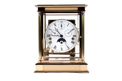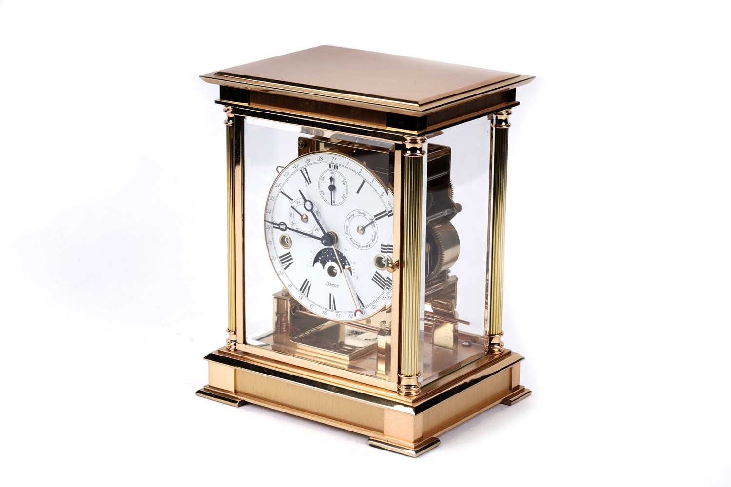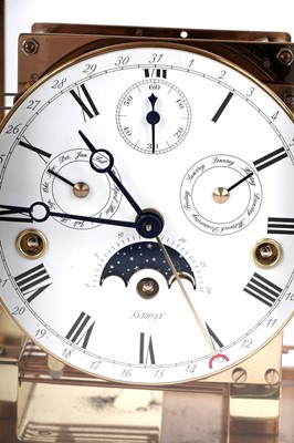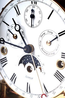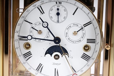 Kieninger: a fine brass cased mantel clock, model no. 1240-06-05, the white enamel Roman dial fitted with an 8-day movement having added complication, including subsidiary seconds, month, tune, moon phase and outer calendar, within a plain architectural case, 11-jewel movement no. J0221, serial no. 1107017946, 19 x 15 x 24cms high, with warranty booklet, bill of sale and other papers.