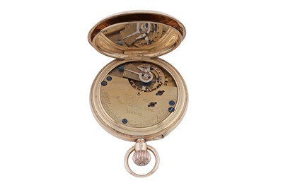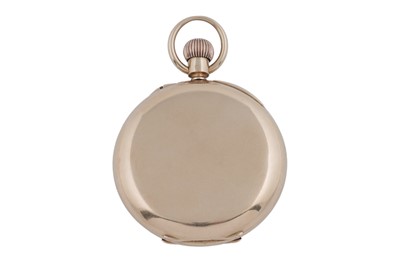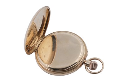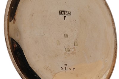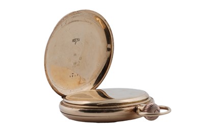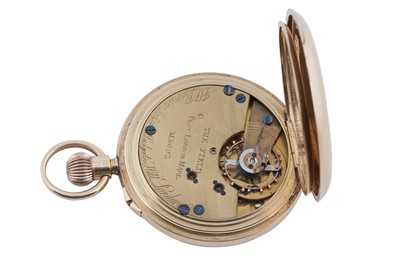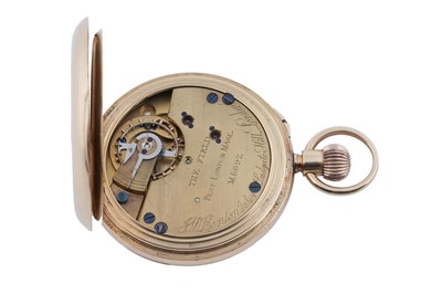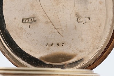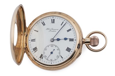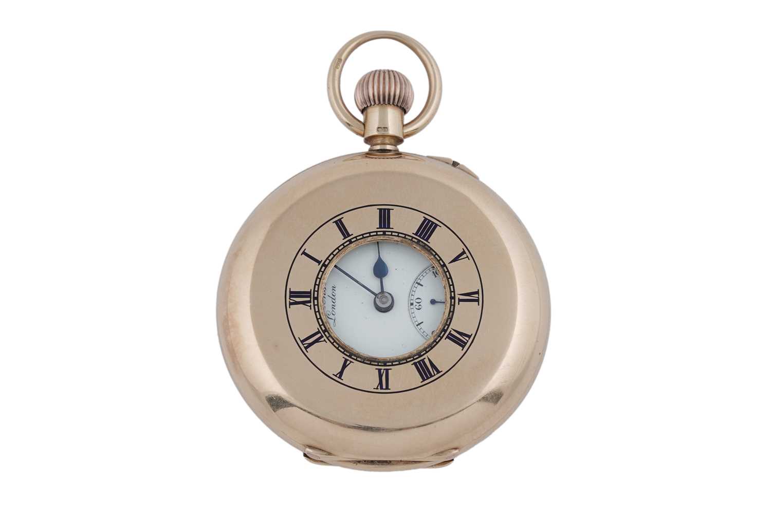 J.W. Benson, 62 & 64 Ludgate Hill, London: an 18ct yellow gold cased half hunter pocket watch, the white enamel roman dial with subsidiary seconds aperture, fitted a crown wound movement 'The Field', no. M56xx, the plain case with blue enamel chapter to front, 48mm wide, 96.8g gross.