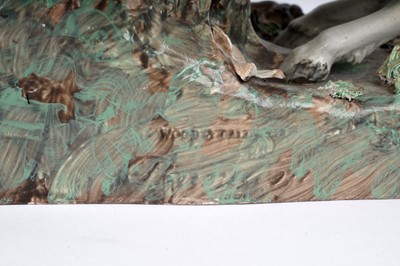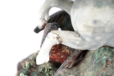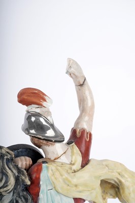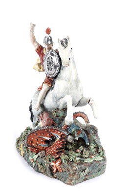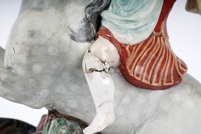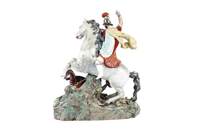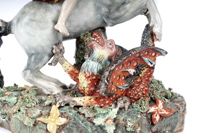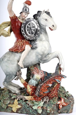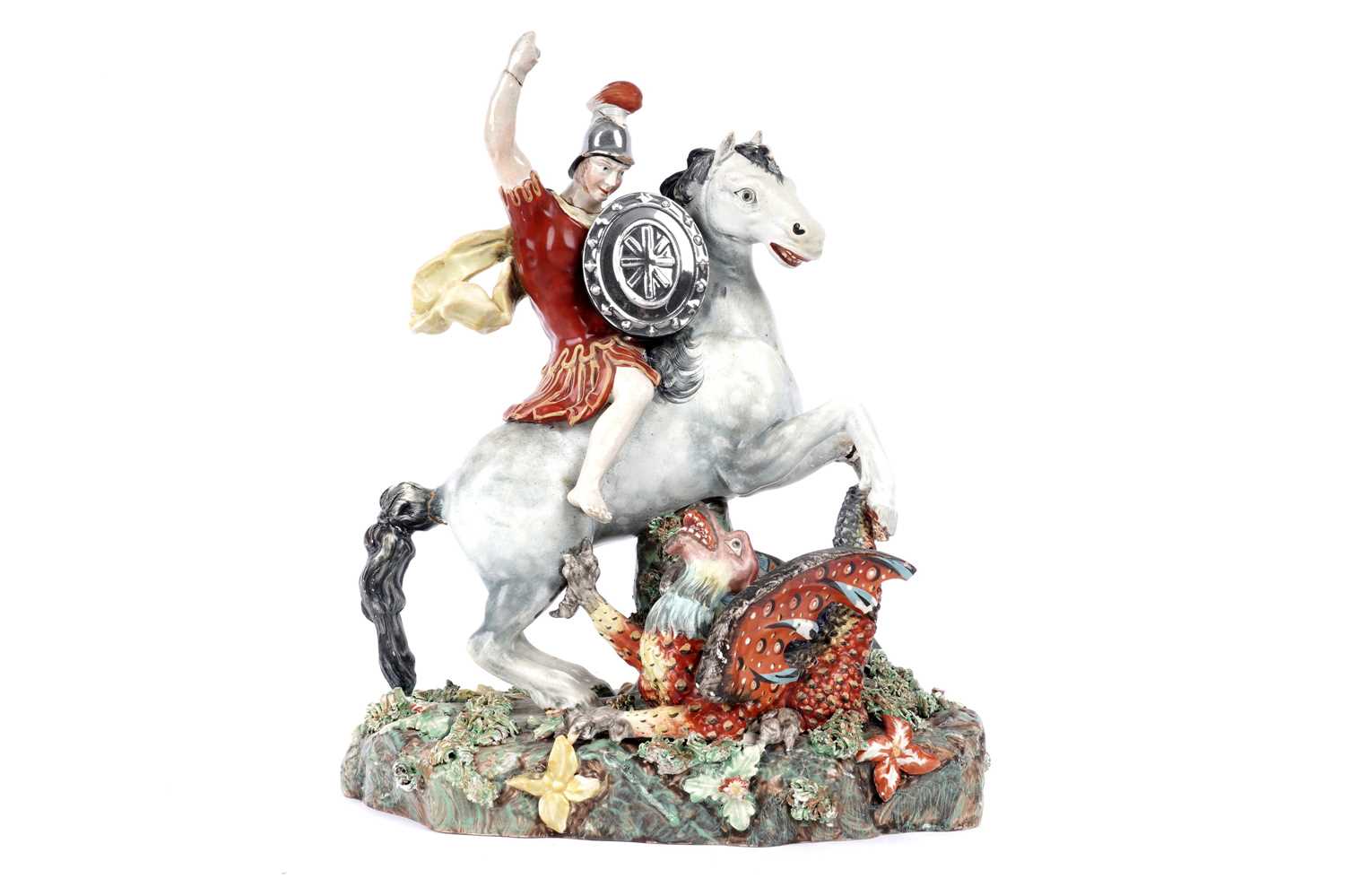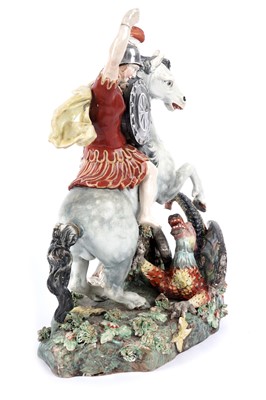 A Wood and Caldwell pearlware figure of Saint George and the dragon, circa 1800, picked out in colours on a sherd applied base, impressed mark, 28cms.